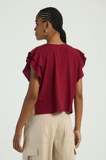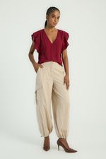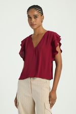 A Blusa possui mangas curtas com babados, decote em V e pequena fenda lateral na barra. Uma blusa que traz sofisticação e conforto ao seu look.