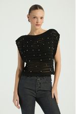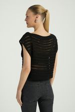 A Blusa, confeccionada em tricot, possui gola canoa, mangas curtas e bordados frontais. Apote no tricot para um look confortável e atemporal.