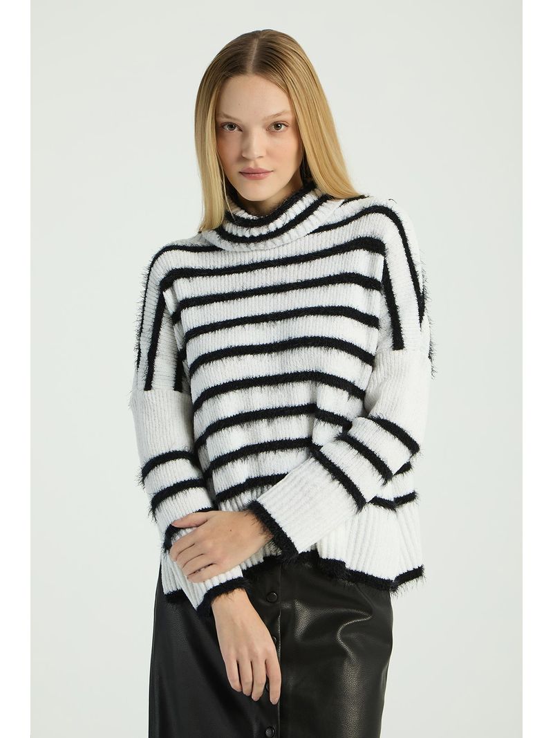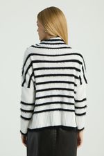 A Blusa listrada, confeccionada em tricot, conta com mangas longas, gola alta e shape solto ao corpo. Combine com saias ou calças da coleção e crie um look casual-chic.