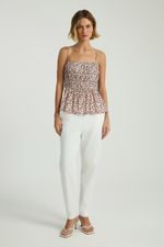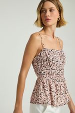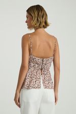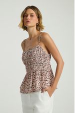 A Blusa estampada possui decote reto com franzimentos no busto e na cintura, alças finas reguláveis e zíper traseiro para fechamento. Combine a blusa estampada com calças ou shorts lisos da coleção e arrase.