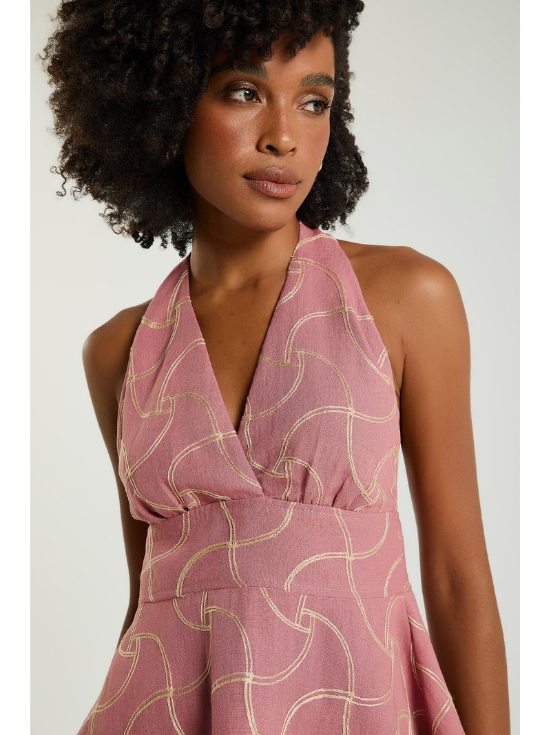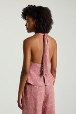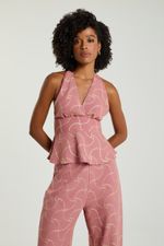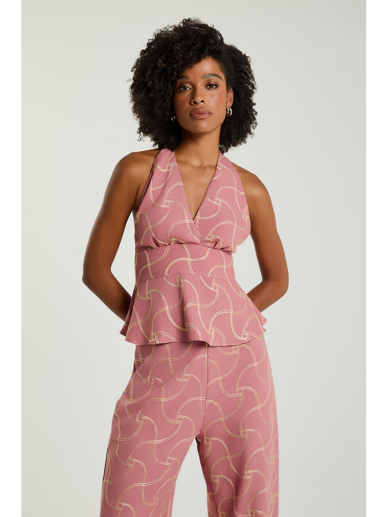 A Blusa, de modelagem frente única, possui decote em V com transpasse, amarração no pescoço, abotoamento traseiro para fechamento e abertura nas costas. Além disso, a blusa apresenta modelo justo na cintura e leves babados na barra. Combine com calça de mesma estampa para um look moderno e elegante.