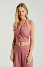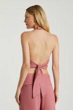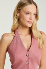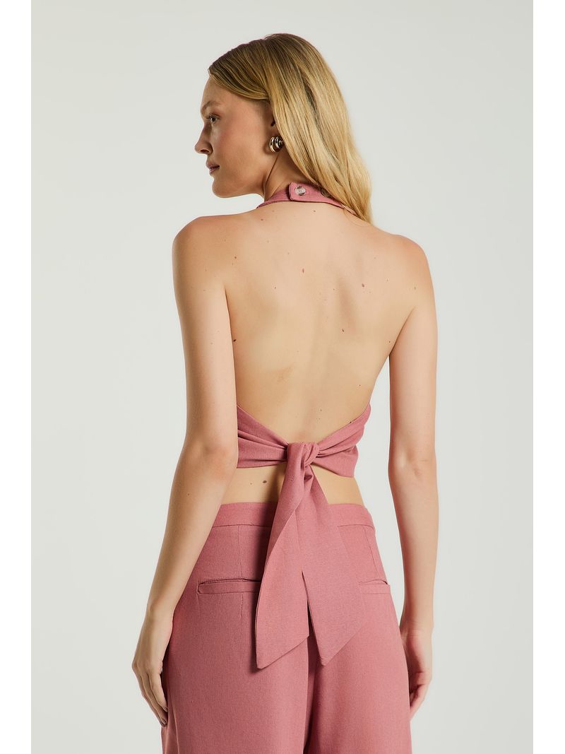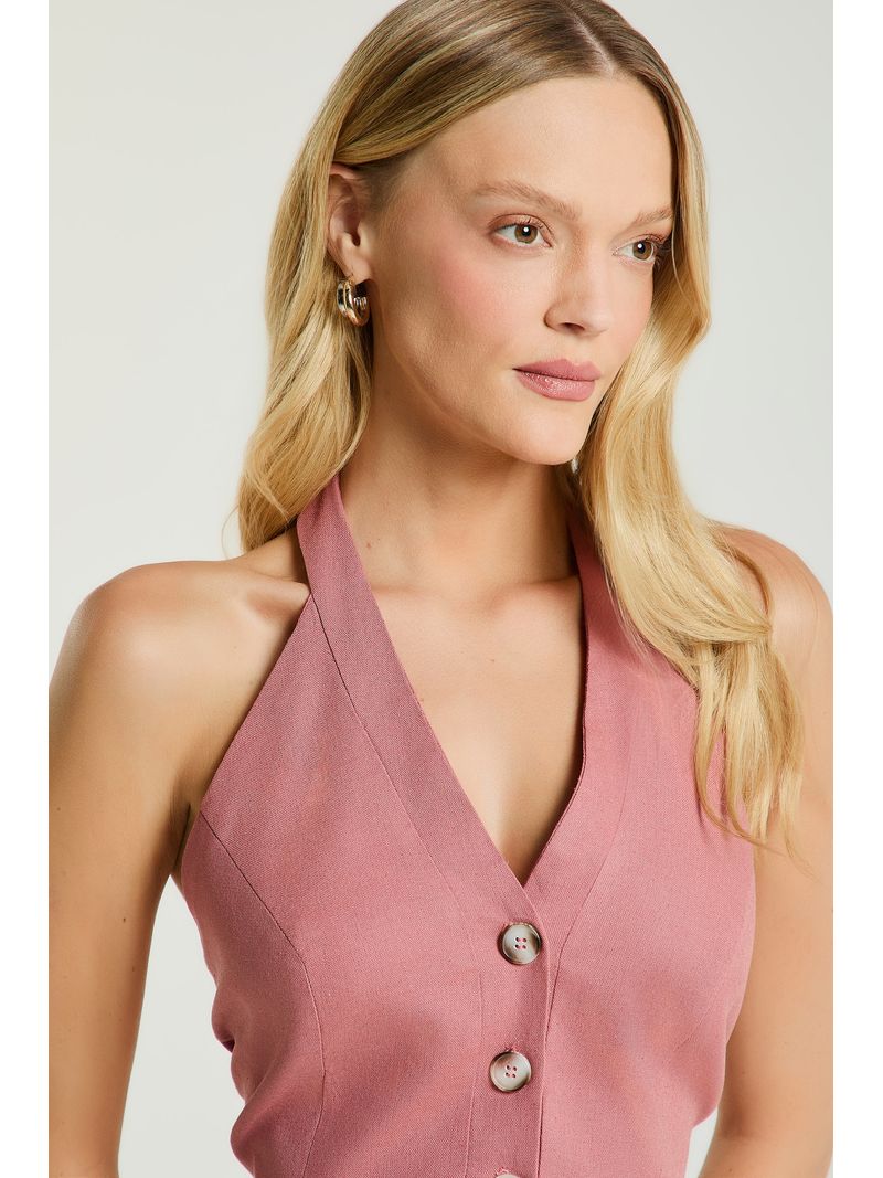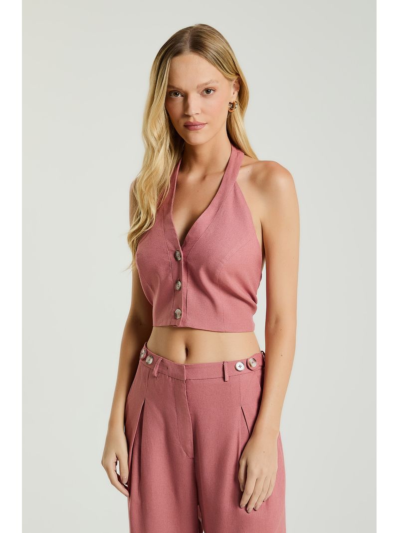 A Blusa, de modelagem frente única, possui decote em V, abotoamento frontal para fechamento, fechamento no pescoço por botões e amarração traseira. Ideal para dias quentes de verão, trazendo frescor e feminilidade ao seu visual.