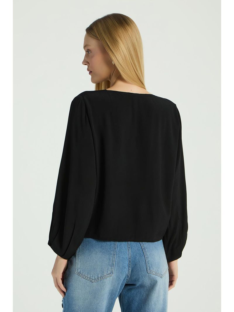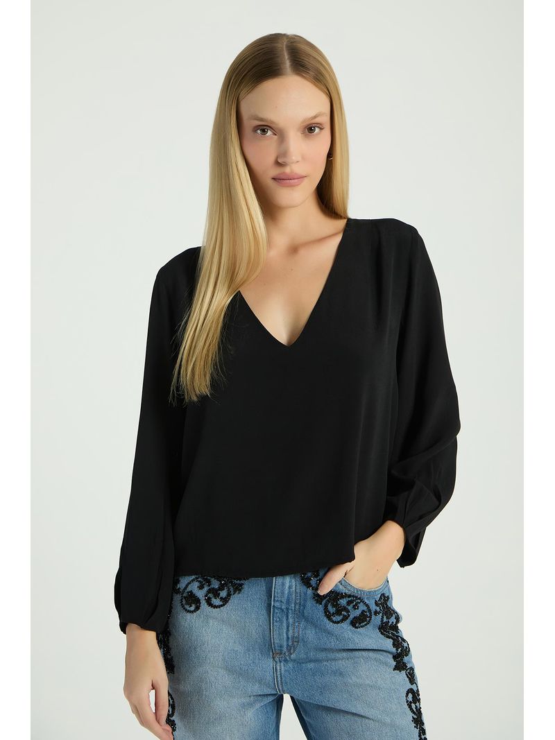 A Blusa, confeccionada em crepe, possui mangas compridas levemente amplas, gola em V, forro interno e shape solto ao corpo. Crie um visual casual-clássico e arrase na estação.