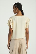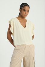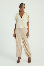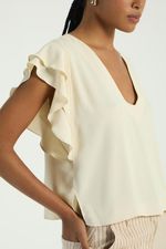 A Blusa possui mangas curtas com babados, decote em V e pequena fenda lateral na barra. Uma blusa que traz sofisticação e conforto ao seu look.