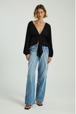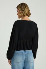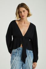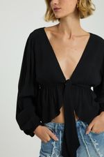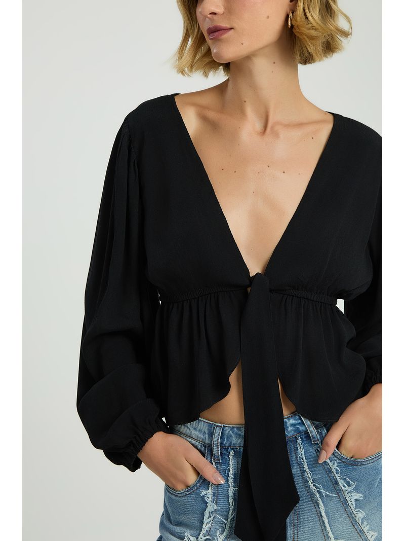 A Blusa apresenta mangas longas levemente bufantes, decote em V com amarração no busto, abertura frontal, barra assimétrica e elástico abaixo do busto. Uma blusa que é uma tendência da estação e indispensável no seu closet.