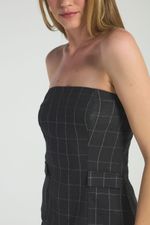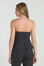 A Blusa, de modelo tomara que caia, possui decote reto, detalhe em bolsos frontais, elástico traseiro, fechamento por zípe e fenda traseira na barra. Uma blusa de modelagem sofisticada e clássica, perfeita para compor os seus office looks.