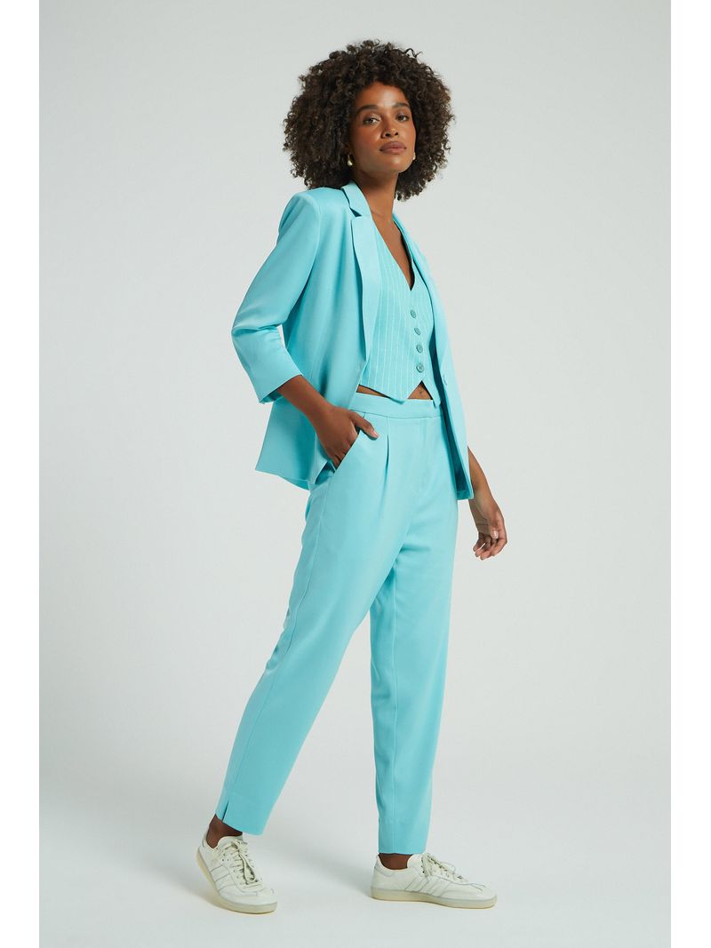 A Calça apresenta bolsos laterais, pregas frontais e fechamento na frente. Uma peça coringa, perfeita para compor looks em diversas ocasiões.