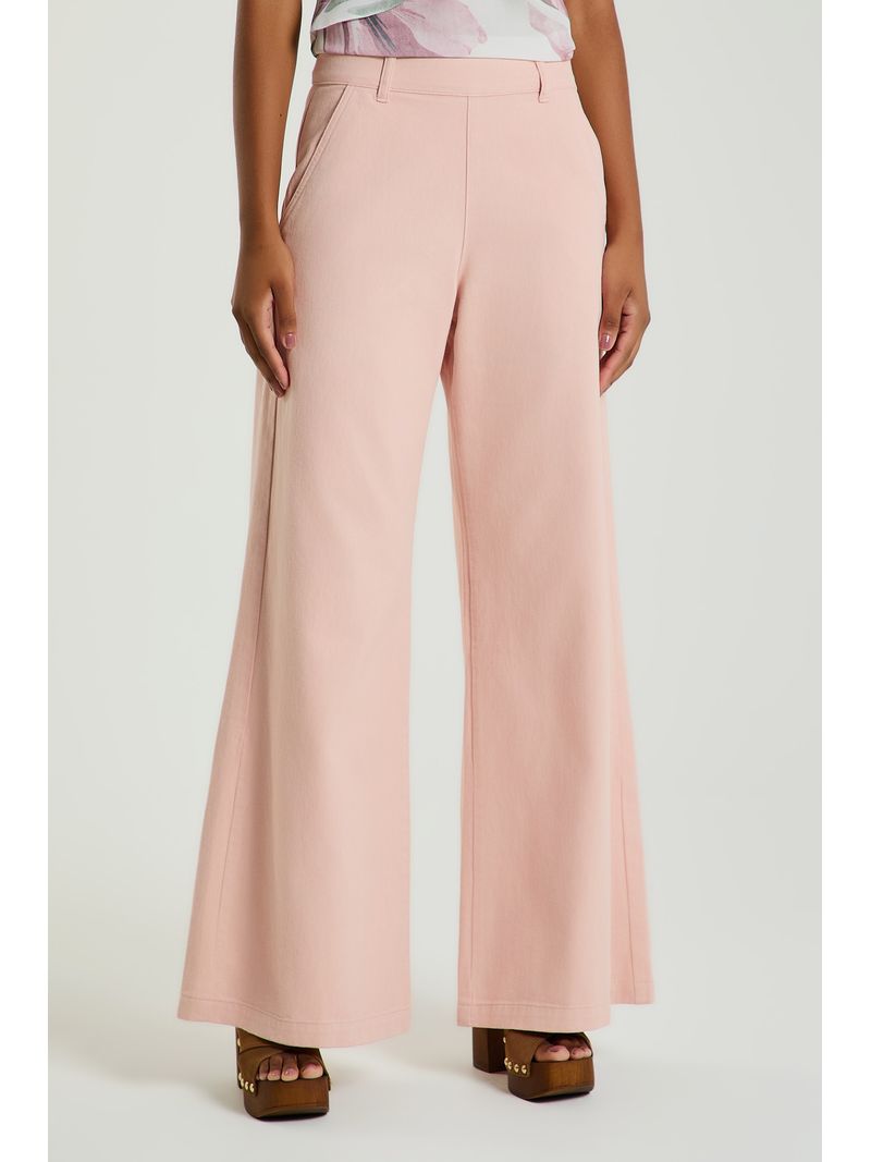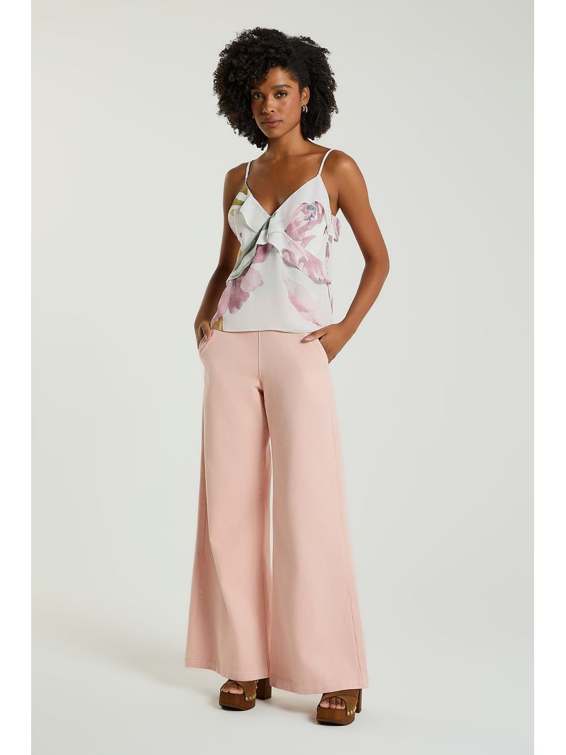 A Calça, confeccionada em sarja, possui modelo pantalona com zíper lateral para fechamento, bolsos laterais e traseiros e espaço para passantes. A calça pantalona une conforto e sofisticação com seu corte solto ao corpo. O comprimento alongado traz destaque à peça e garante um visual imponente e feminino.