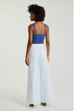 A Calça, confeccionada em sarja, possui modelo pantalona com zíper lateral para fechamento, bolsos laterais e traseiros e espaço para passantes. A calça pantalona une conforto e sofisticação com seu corte solto ao corpo. O comprimento alongado traz destaque à peça e garante um visual imponente e feminino.
