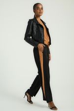 A Calça bicolor possui lastex no cós, amarração frontal, bolsos laterais e recortes frontais. Uma calça confortável e delicada, perfeita para compor office looks e looks elegantes.