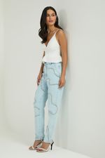 A Calça jeans, de lavagem clara, possui bordados frontais, bolsos laterais e traseiros e fechamento frontal por zíper e botão. A peça jeans ganha charme extra com bordados delicados, que trazem personalidade e um ar handmade ao visual.