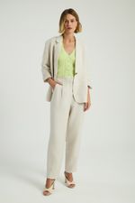 A Calça, confeccionada em linho, possui pregas frontais, bolsos laterais e traseiros, recorte na barra da calça. Feita em linho, a calça alia sofisticação e conforto. Possui modelagem solta ao corpo e acabamento que garante leveza, ideal para looks do dia a dia ou produções mais refinadas.