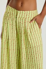 A Calça estampada, de modelo pantalona, possui pregas frontais, bolsos laterais e fechamento frontal. Ideal para quem busca uma calça confortável e estilosa para compor os looks do dia a dia.