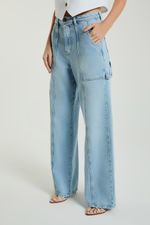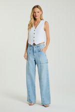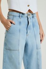 A Calça pantalona jeans possui bolsos laterais e traseiros, recortes frontais e traseiros e detalhes laterais. Um clássico renovado para looks cheios de personalidade.