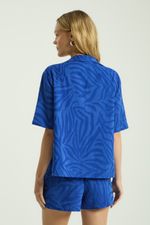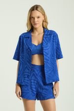 A Camisa, confeccionada em tecido jacquard, possui mangas curtas, abotoamento frontal para fechamento, gola e pequenas fendas laterais na barra. Usada aberta, a camisa funciona como uma terceira peça leve que atualiza o visual com praticidade.