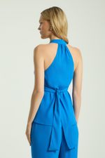 A Camiseta apresenta decote em V com detalhe torcido no busto, amarração traseira e modelagem levemente solta ao corpo. Combine com calça de mesma cor para um look monocromático elegante e moderno.