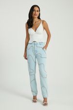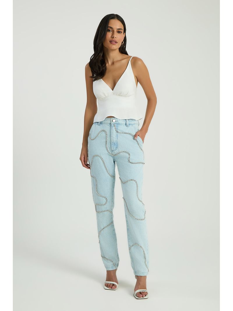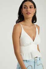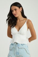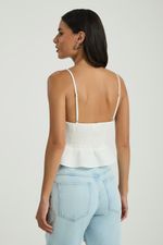 A Camiseta apresenta decote em V profundo com franzimentos no busto, pala na cintura e pequenos babados na barra. A camiseta também conta com alças finas reguláveis e lastex traseiro, que permite um melhor ajuste ao corpo. Uma camiseta versátil, indispensável para qualquer guarda-roupa de verão.