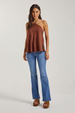 A Camiseta, confeccionada com decote em V invertido, apresenta modelo frente única, alças finas amarradas ao pescoço, bordados e pequenas fendas laterais na barra. A camiseta é uma opção versátil, transita bem entre ocasiões informais e produções noturnas.