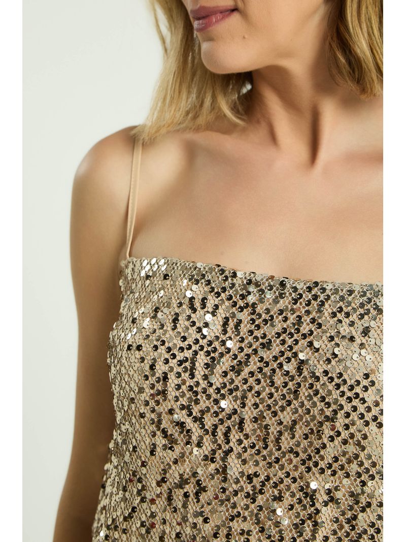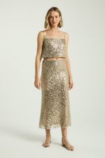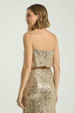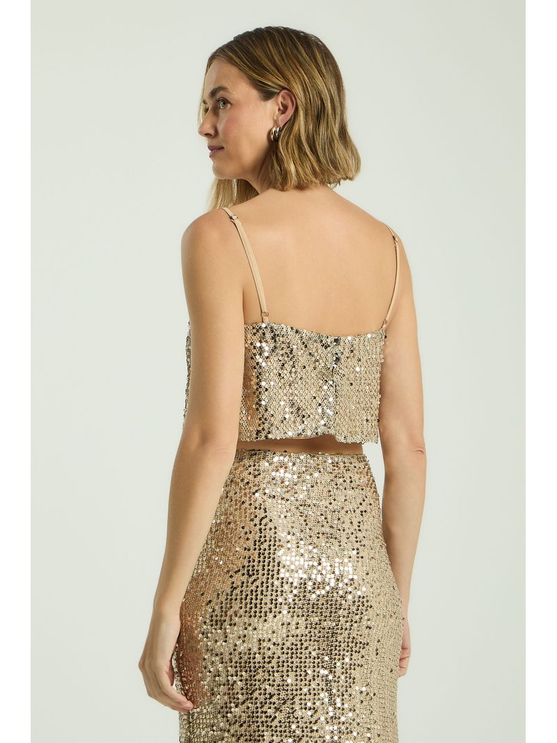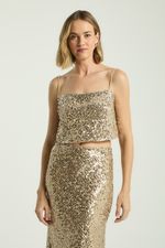 A Camiseta, de comprimento cropped, foi confeccionada em tecido de paetê e apresenta decote reto e alças finas reguláveis. Combine com saia de tecido paetê para um look moderno, elegante e cheio de personalidade.