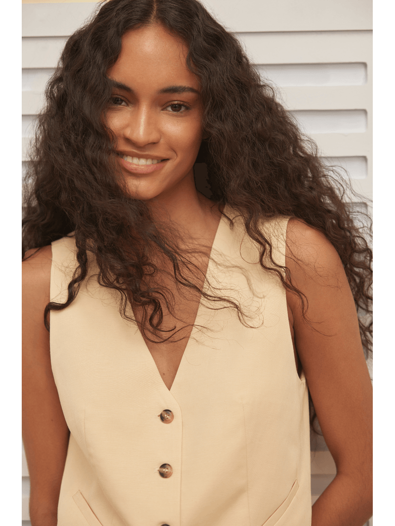 O Colete possui decote em V, abotoamento frontal para fechamento, barra assimétrica e detalhe em bolso frontal. O colete traz um ar contemporâneo ao visual, valorizando produções básicas.