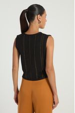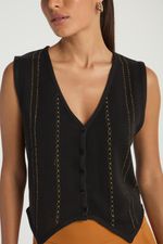 O Colete, confeccionado em tricot, possio decote em V, fechamento frontal por botões, alças largas, fios em lurex e barra assimétrica. Use o colete fechado, como peça única, ou aberto, combinando com croppeds ou blusas de manga longa e fique por dentro das grandes trends da estação.