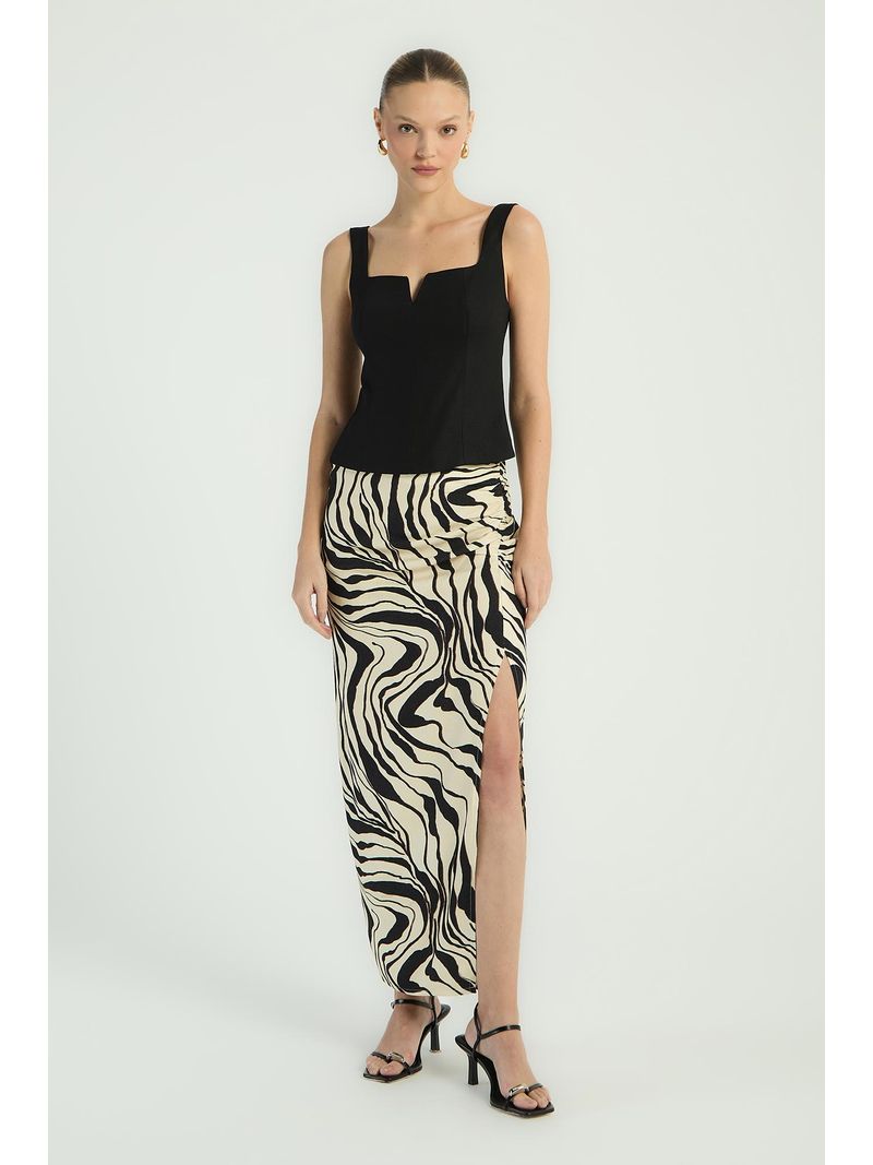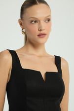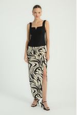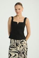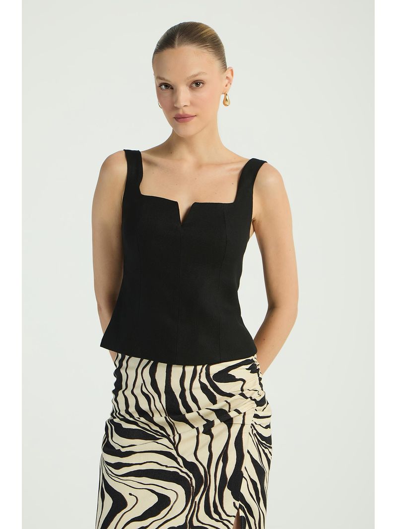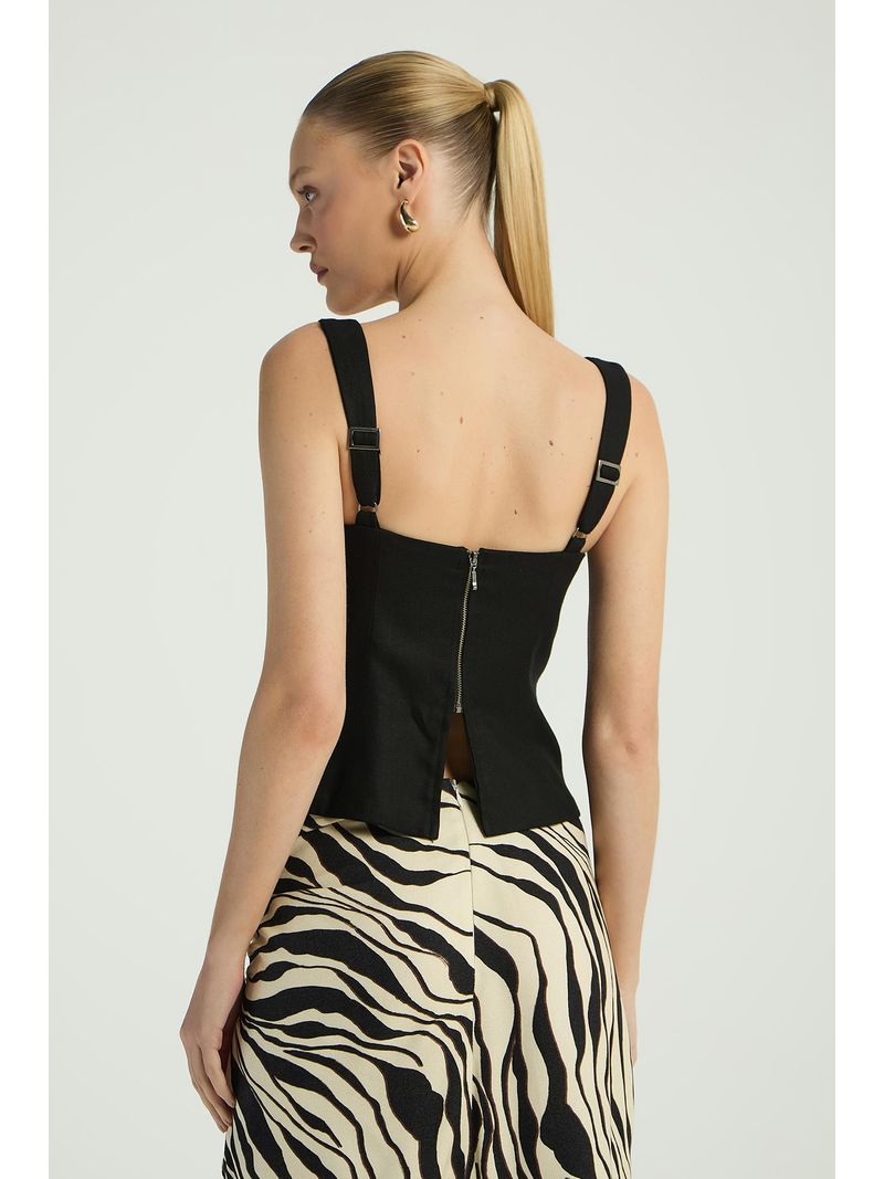 A Blusa, de estilo corpete, possui decote reto com pequeno recorte em V, alças médias reguláveis, zíper traseiro para fechamento e barra levemente ampla. Uma peça coringa, que valoriza qualquer composição com um toque de elegância.