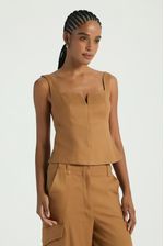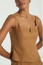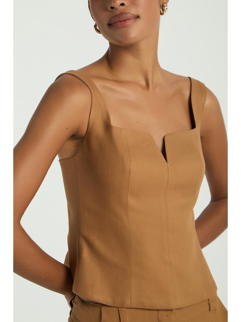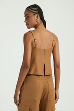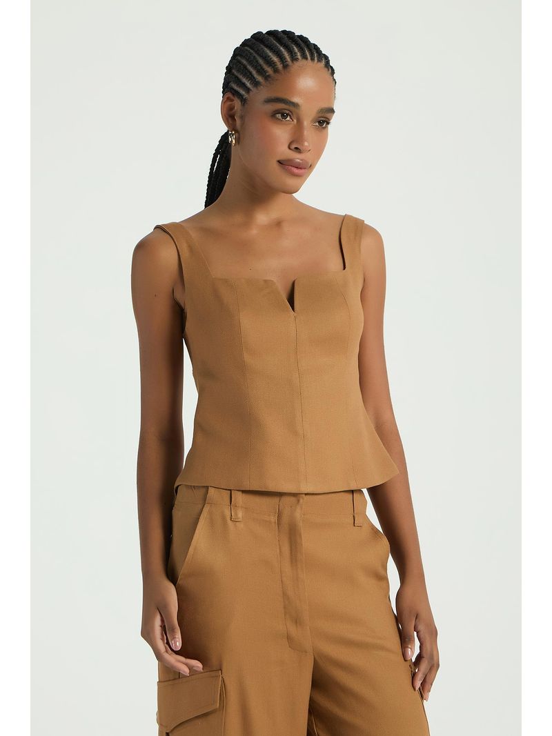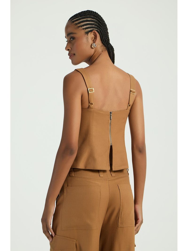 A Blusa, de estilo corpete, possui decote reto com pequeno recorte em V, alças médias reguláveis, zíper traseiro para fechamento e barra levemente ampla. Uma peça coringa, que valoriza qualquer composição com um toque de elegância.