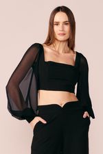 Além disso, este Cropped é muito elegante e sofisticado, pois conta com decote reto e mangas compridas em Chiffon, levemente amplas, que dão um toque especial à peça.