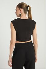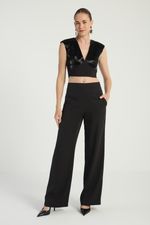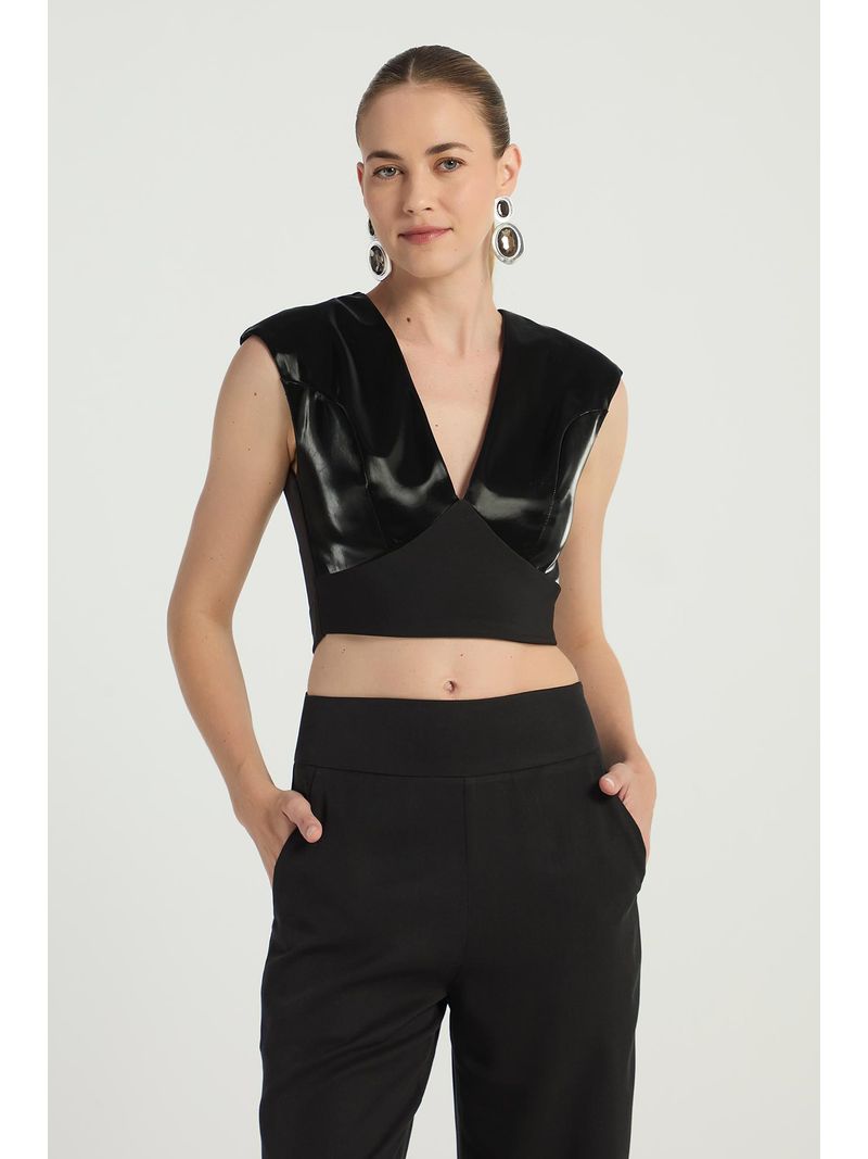 O Cropped, confeccionado com mix de tecidos, possui decote em V com tecido vinil, modelo justo ao corpo e zíper traseiro para fechamento. Croppeds pretos nunca saem de moda e formam uma composição elegante e moderna quando combinados com calças e saias longas.