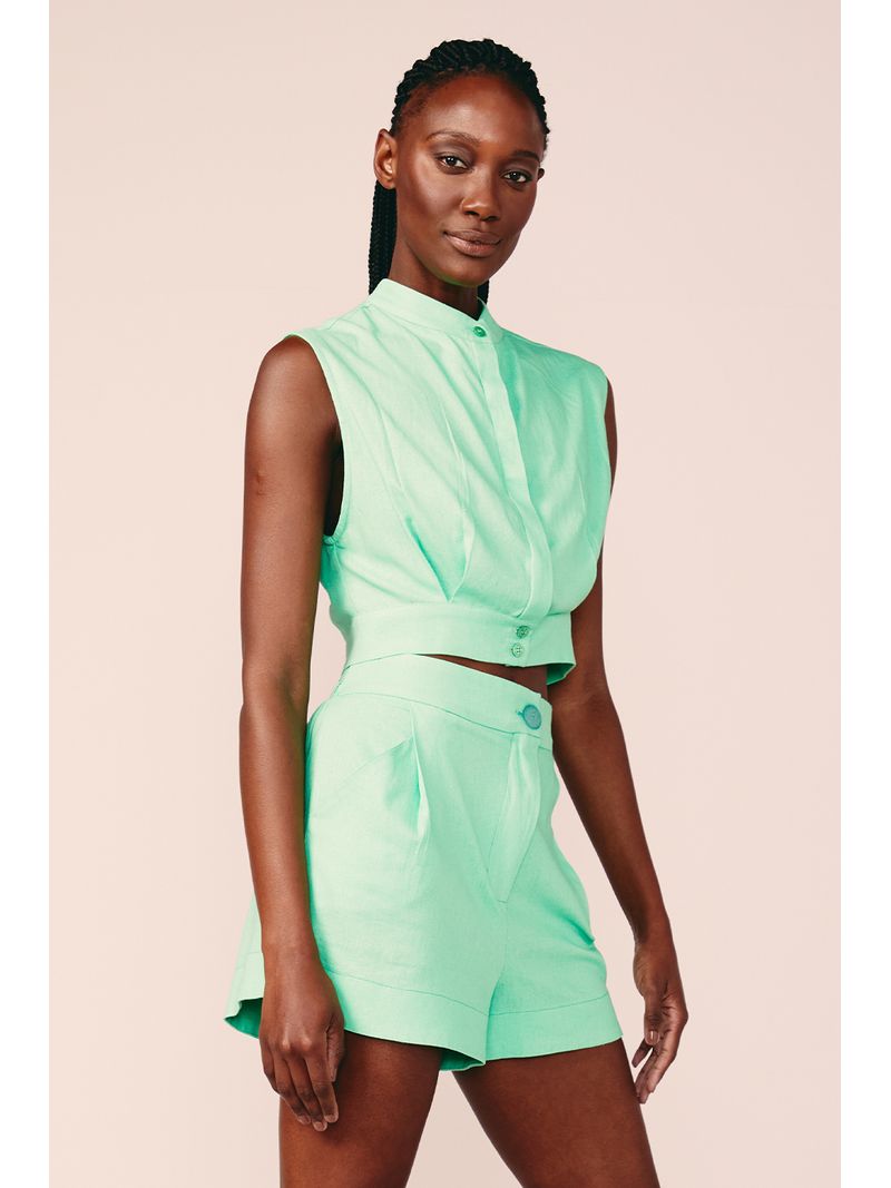 Além disso, este Cropped é uma peça-chave no closet feminino, pois conta gola levemente alta e fechamento por botões. Além disso, o Cropped não possui mangas, fazendo com que a peça seja fresca e perfeita para diversas ocasiões.