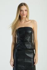 O Cropped, de modelo tomara que caia, foi confeccionado em poliuretano ecológico e possui decote reto, recortes em seu comprimento, zíper traseiro para fechamento e barra levemente ampla. Combine com saia em poliuretano ecológico para um visual sofisticado e elegante.
