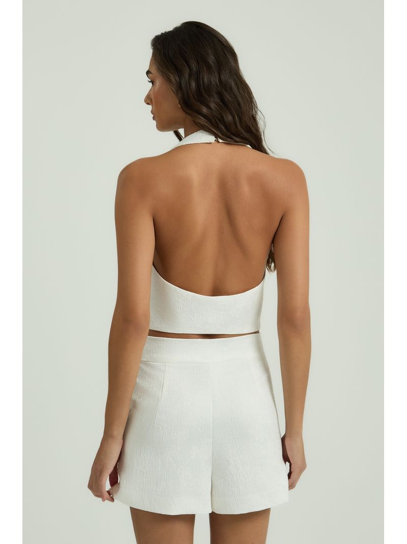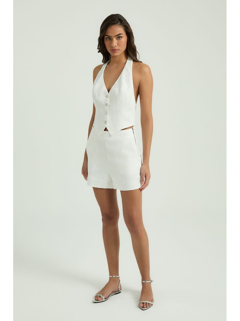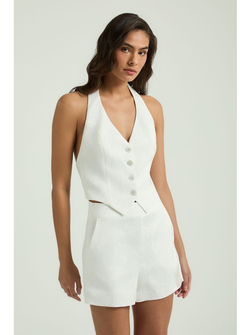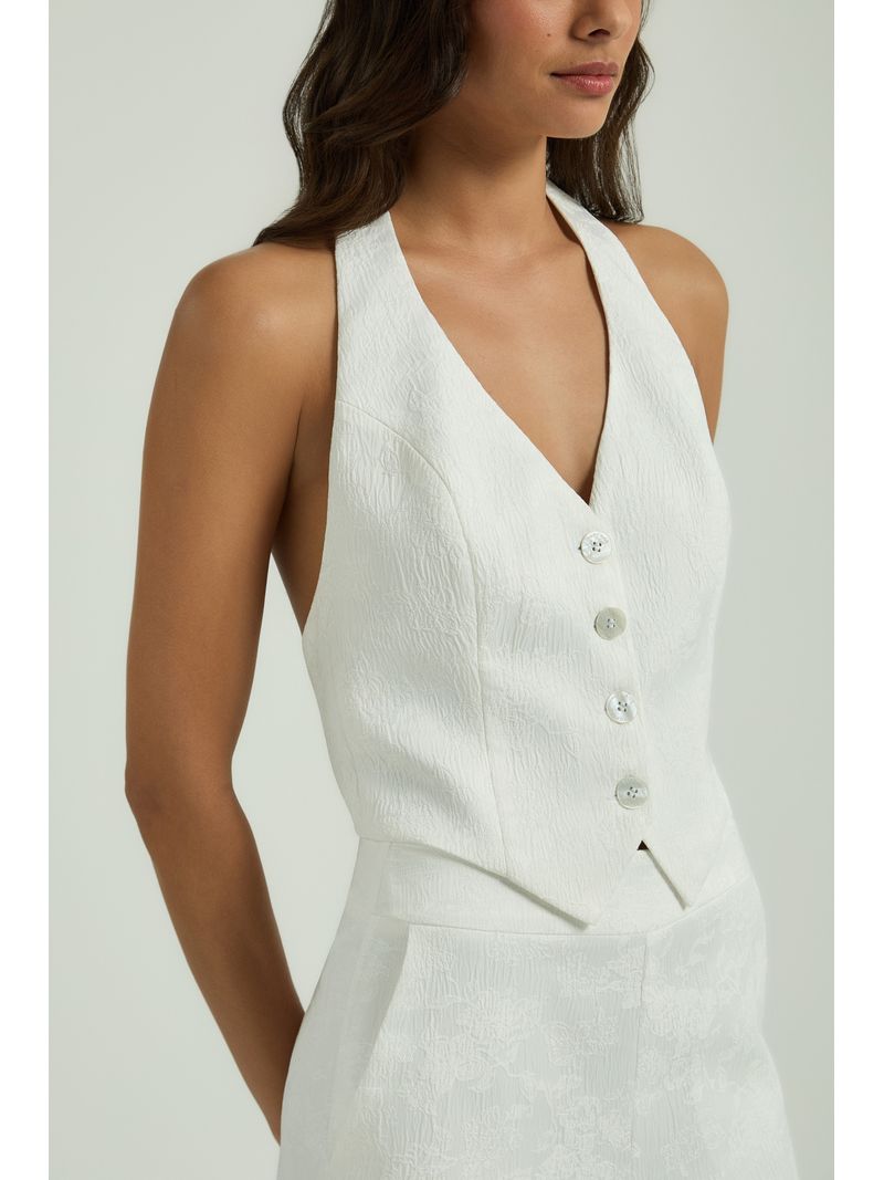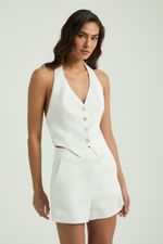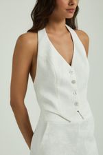 O Colete, de modelo frente única, conta com abotoamento frontal, fechamento no pescoço com colchetes e barra assimétrica. O colete valoriza o look com sofisticação, trazendo elegância à sua composição.