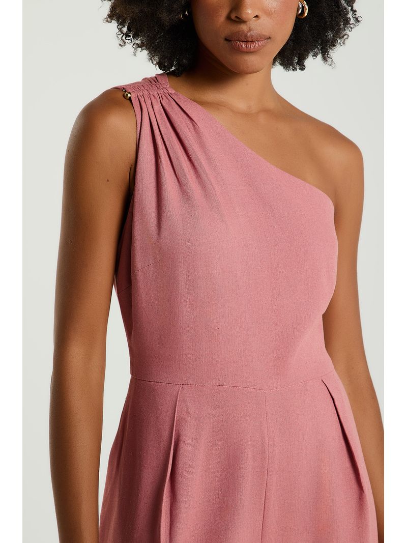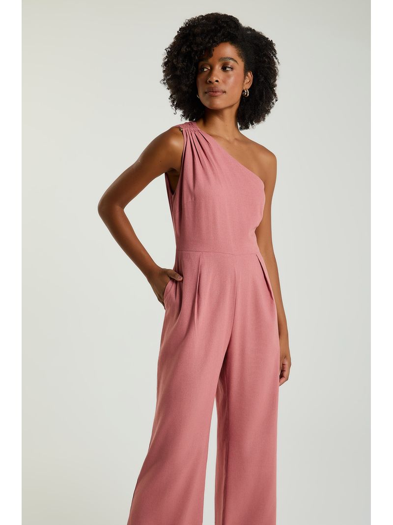 O Macacão, confeccionado com modelo de um ombro só, apresenta alça larga com franzimento e detalhe no ombro, bolsos laterais, pregas frontais e zíper lateral para fechamento. Com toque natural e caimento leve, o macacão em linho é uma peça curinga para composições elegantes e descomplicadas.