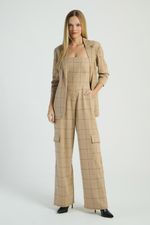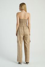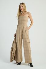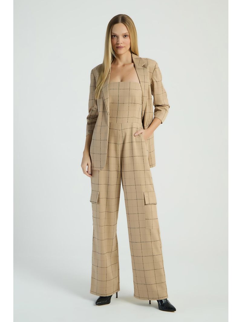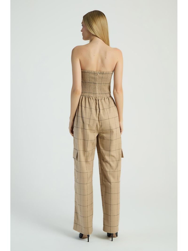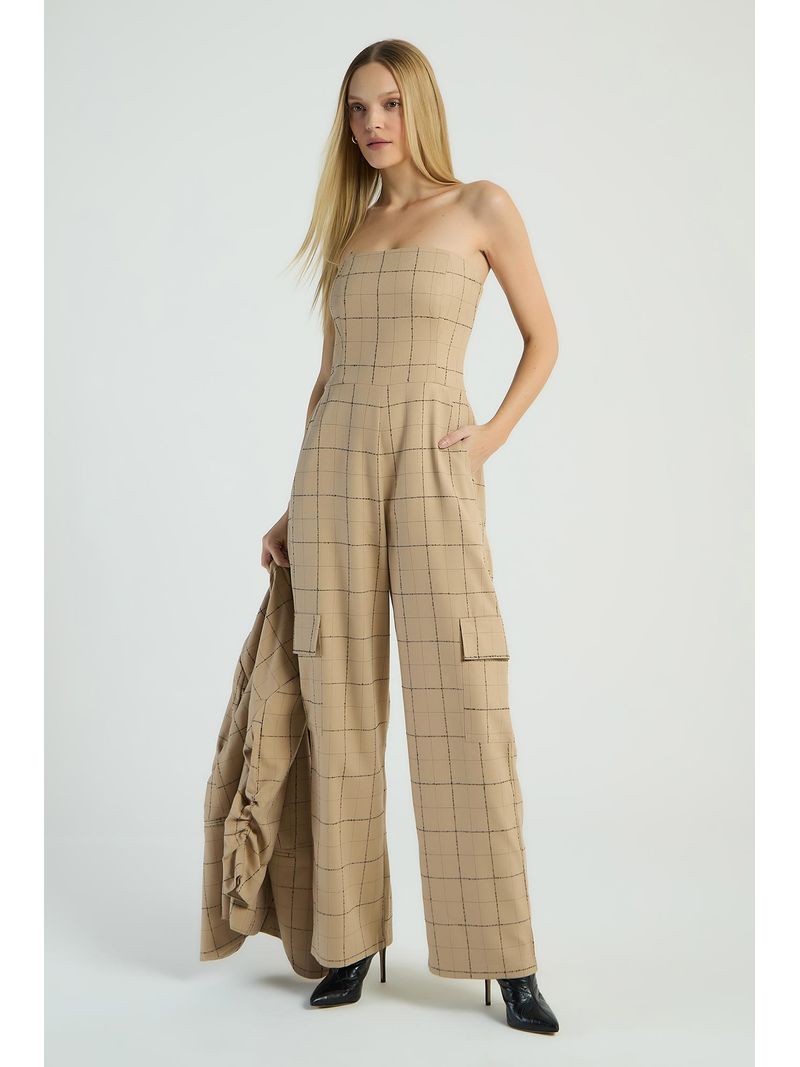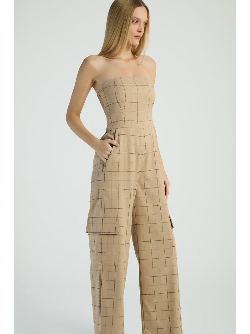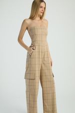 O Macacão xadrez, de modelo tomara que caia, possui calça de estilo cargo, bolsos laterais e costas com lastex e zíper para fechamento. Estampas xadrez são perfeitas para looks com um toque retrô e atual.