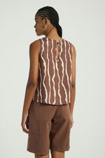 A Regata estampada conta com decote redondo, alças largas, recorte vazado traseiro com fechamento por botão e modelagem solta ao corpo. Ideal para compor looks básicos, adicionando estilo com uma estampa única.