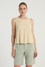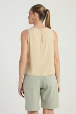 A Regata estampada conta com decote redondo, alças largas, recorte vazado traseiro com fechamento por botão e modelagem solta ao corpo. Ideal para compor looks básicos, adicionando estilo com uma estampa única.