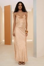 A Saia longa estampada apresenta modelagem levemente justa ao corpo e barra fluida. Seu caimento leve e fluidez valorizam o movimento e a silhueta de forma natural.