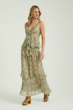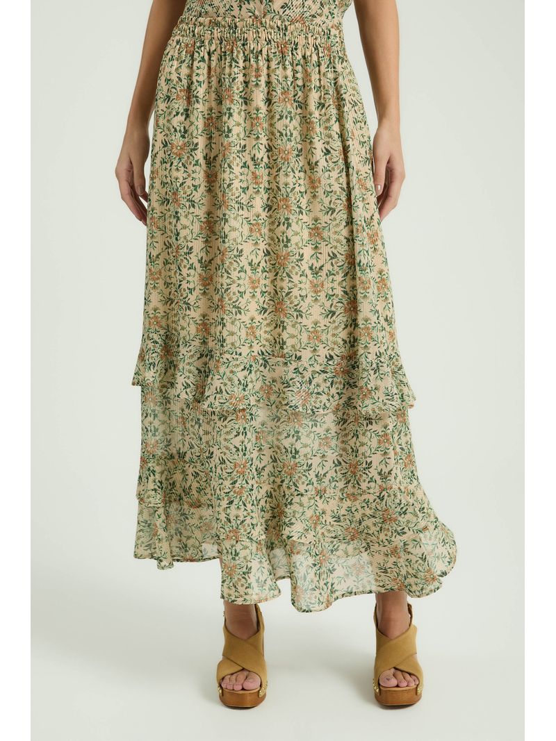 A Saia longa, confeccionada com tecido floral, possui elástico no cós e saia fluida, com babados. A saia longa é perfeita para criar produções leves e descontraídas.