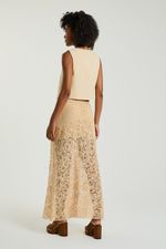 A Saia, de comprimento longo, foi confeccionada em renda e possui recorte assimétrico, elástico no cós e forro. A saia em renda adiciona um toque casual-chique ao visual com sua textura diferenciada.