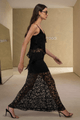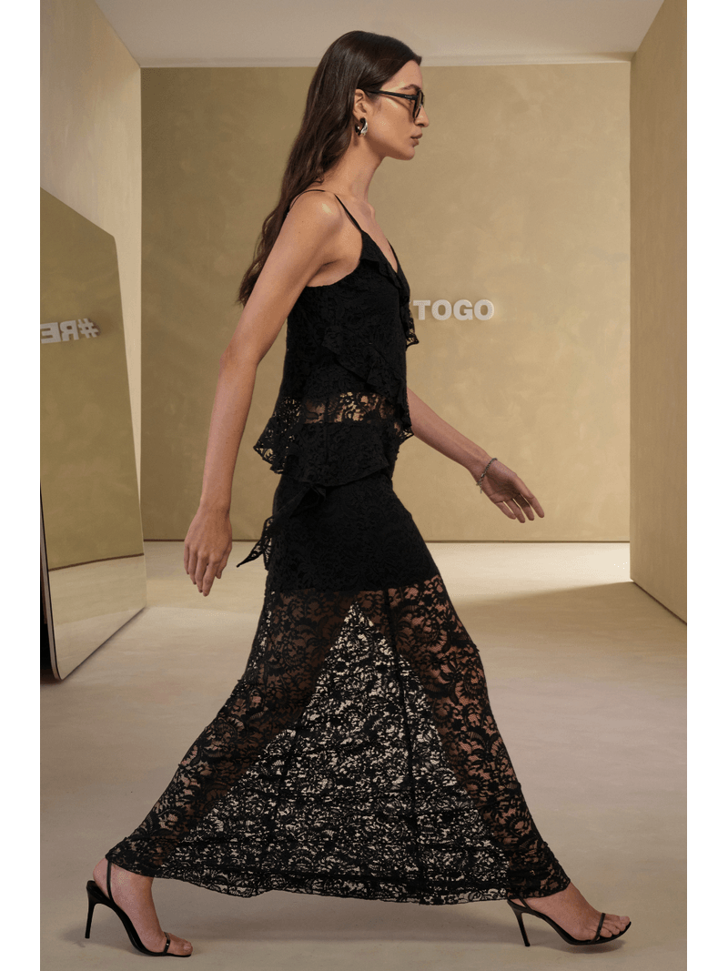 A Saia, de comprimento longo, foi confeccionada em renda e possui recorte assimétrico, elástico no cós e forro. A saia em renda adiciona um toque casual-chique ao visual com sua textura diferenciada.