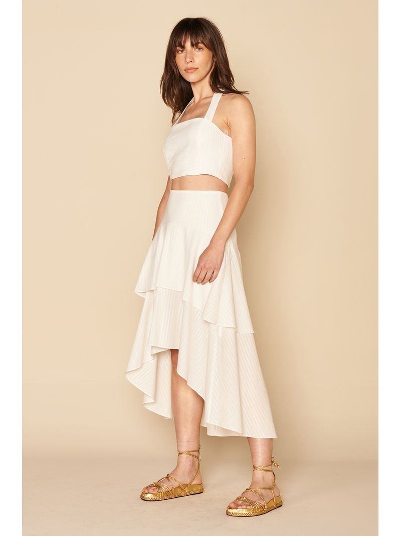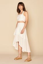 Ela possui barra irregular, babados duplos e zíper traseiro para fechamento. Ela da um toque de estilo e feminilidade ao look!
