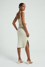 A Saia midi foi confeccionada em tricot e possui fios em lurex, shape justo ao corpo e fenda lateral na barra. Uma saia atemporal que traz elegância ao seu look.