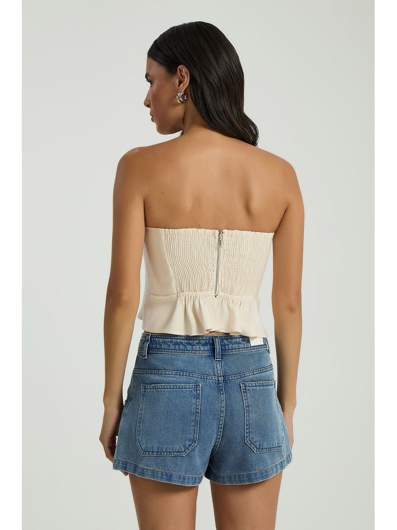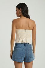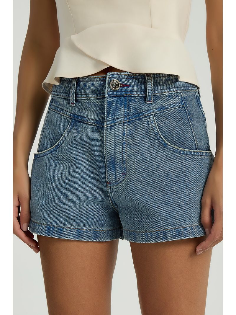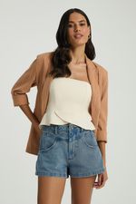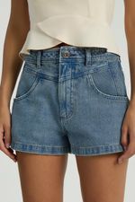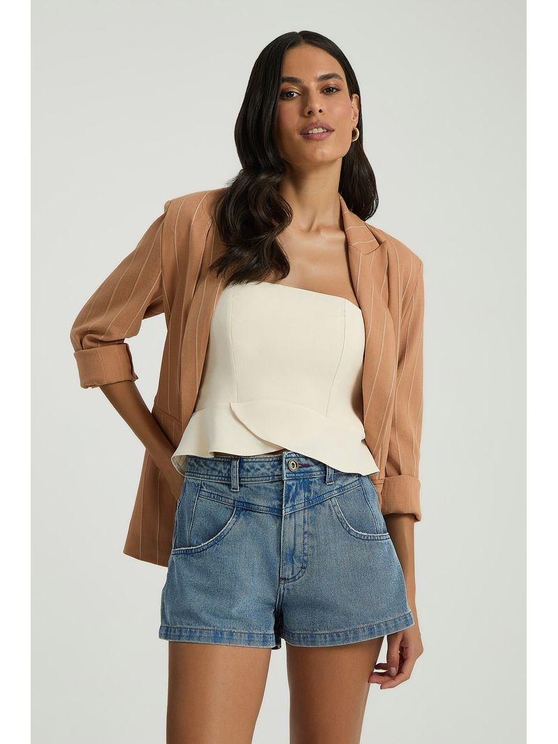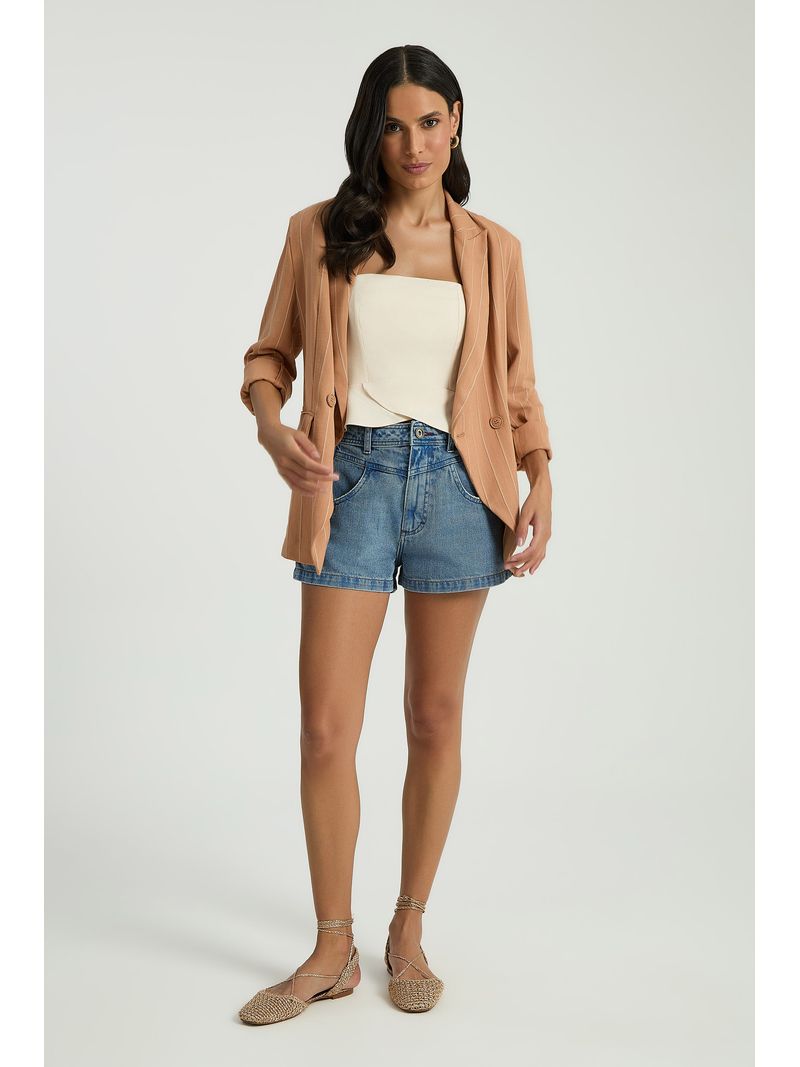 O Short jeans apresenta bolsos laterais e traseiros, recortes frontais e fechamento por zíper e botão. Ideal para trazer praticidade para os seus looks casuais.