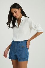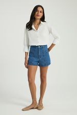 O Short jeans possui bolsos frontais e traseiros, botões frontais no bolso, recortes em seu comprimento e fechamento padrão por zíper e botão. O short jeans é uma peça coringa no closet e perfeito para criar composições práticas e modernas.