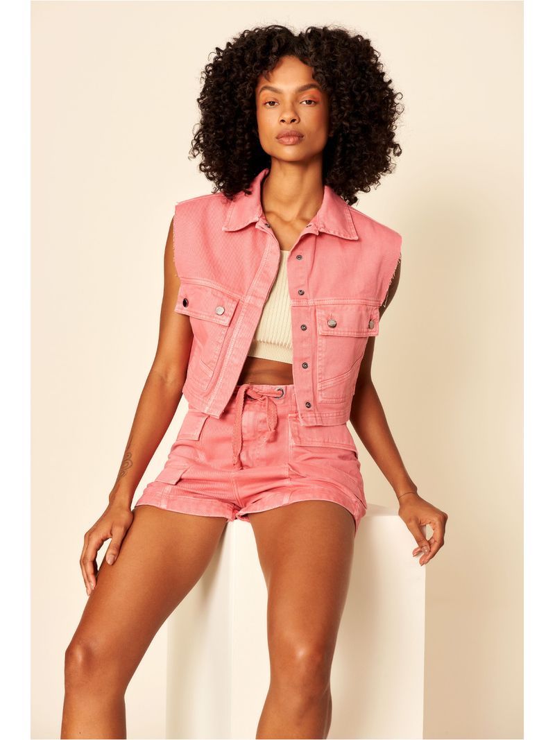 Short estilo cargo, com bolsos lateria, amarração na cintura e fechamento por ziper e botão.