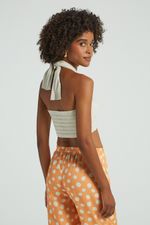 O Top, confeccionado em tricot, conta com modelagem em frente única com amarração no pescoço com alças largas, argola frontal com pequenos franzimentos no busto e barra assimétrica. Uma peça elegante e atemporal, que pode ser combinada com calças e blazers da coleção.