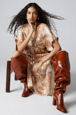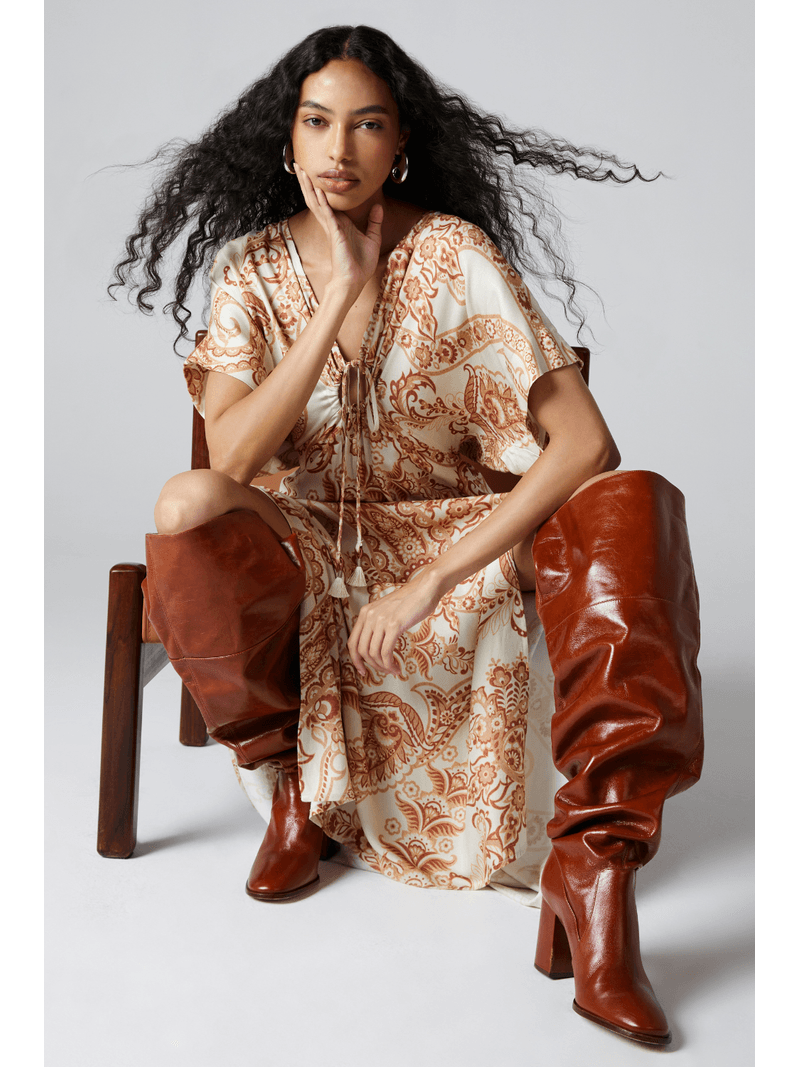 O Vestido estampado, de comprimento longo, possui decote em V com argola e amarração no busto, manhas curtas amplas, elástico na cintura e fenda lateral na barra. O vestido foi confeccionado em tecido leve e fluido e, com sua estampa atemporal, é ideal para eventos diurnos ou noturnos. *As peças podem variar a estampa de acordo com o corte. A tonalidade das cores pode variar de acordo com a sua tela/monitor.