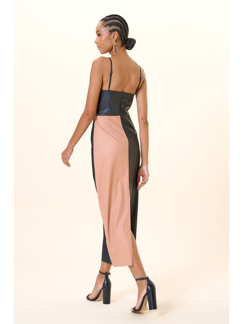 O Vestido bicolor foi confeccionado em couro ecológico e possui decote em V, alças finas reguláveis, zíper traseiro para fechamento e fenda traseira. Uma opção sofisticada e elegante, perfeita para datas especiais.