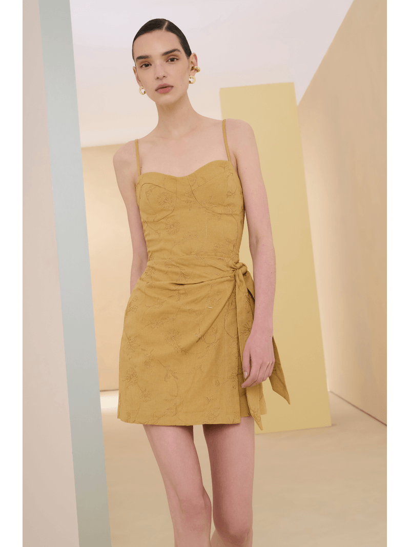 O Vestido, de comprimento curto, possui bordados em seu comprimento, decote em coração com recortes, alças finas reguláveis, lastex traseiro e saia com amarração lateral. Com seu design moderno, o vestido é uma opção versátil para o dia a dia, que une conforto e estilo com toque feminino.