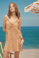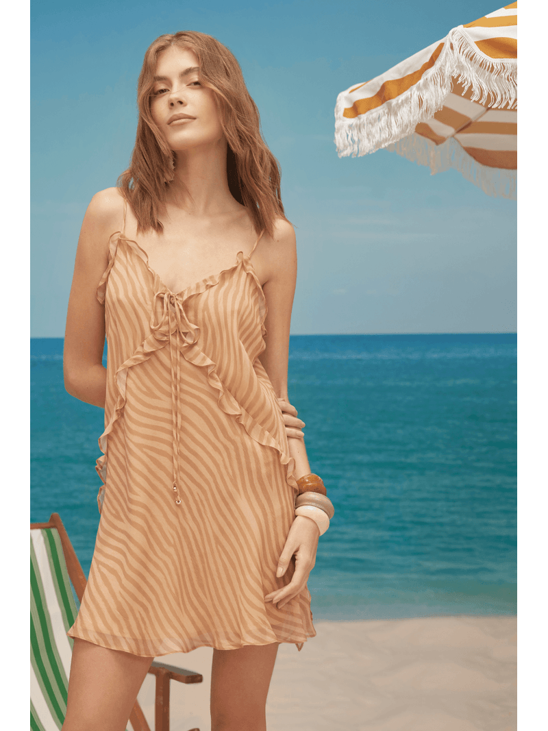 O Vestido curto estampado apresenta babados frontais, decote arredondado, alças finas reguláveis e alças finas amarradas ao pescoço e modelagem levemente solta ao corpo. Uma peça que traz personalidade com praticidade e frescor.